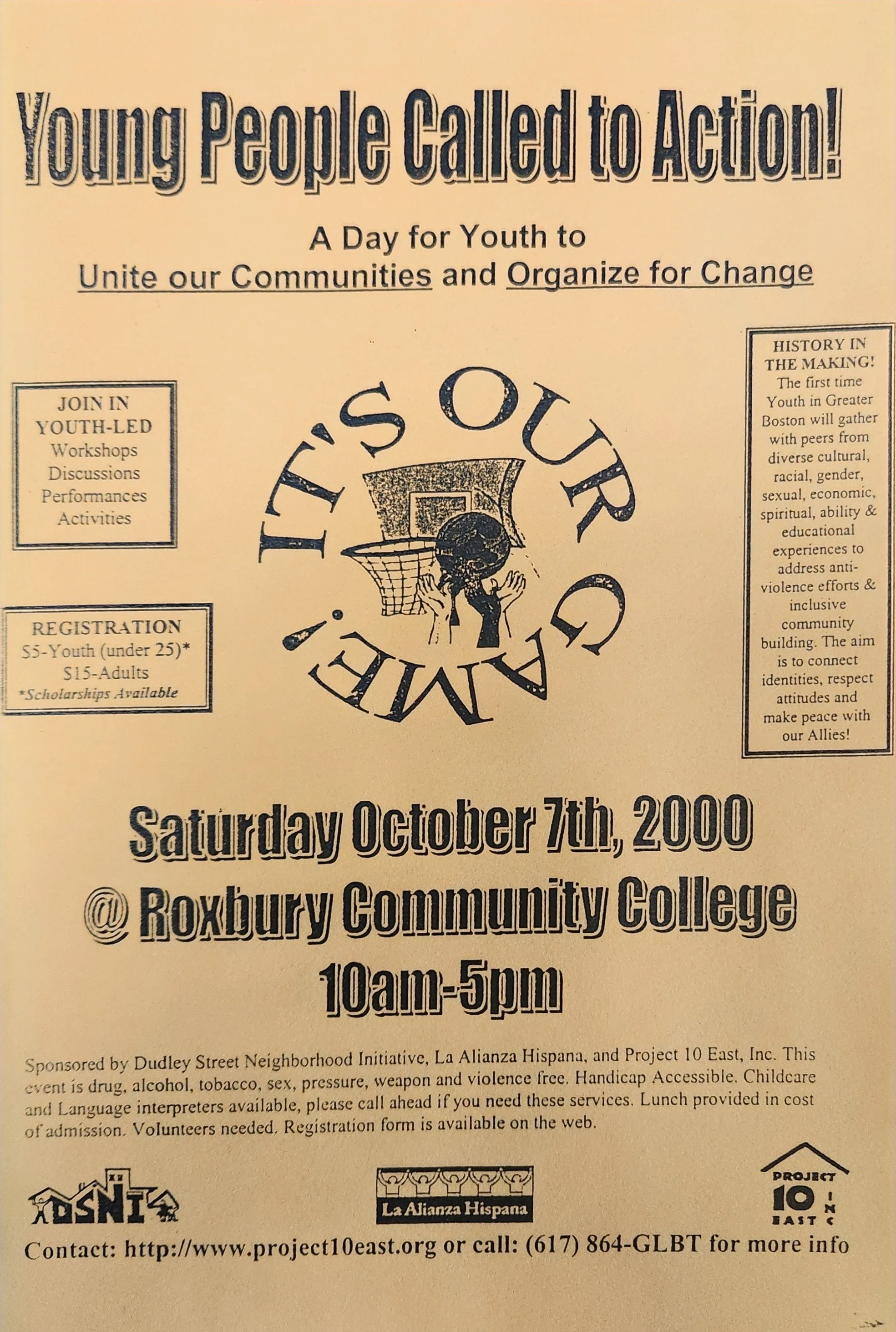 Project 10 East sponsored all kinds of youth-centered events. This flyer for a 2000 event, “Young People Called to Action” was about encouraging and empowering youth to advocate for social change. Queer History Boston, Coll. 028 - Project 10 East, Folder 60.