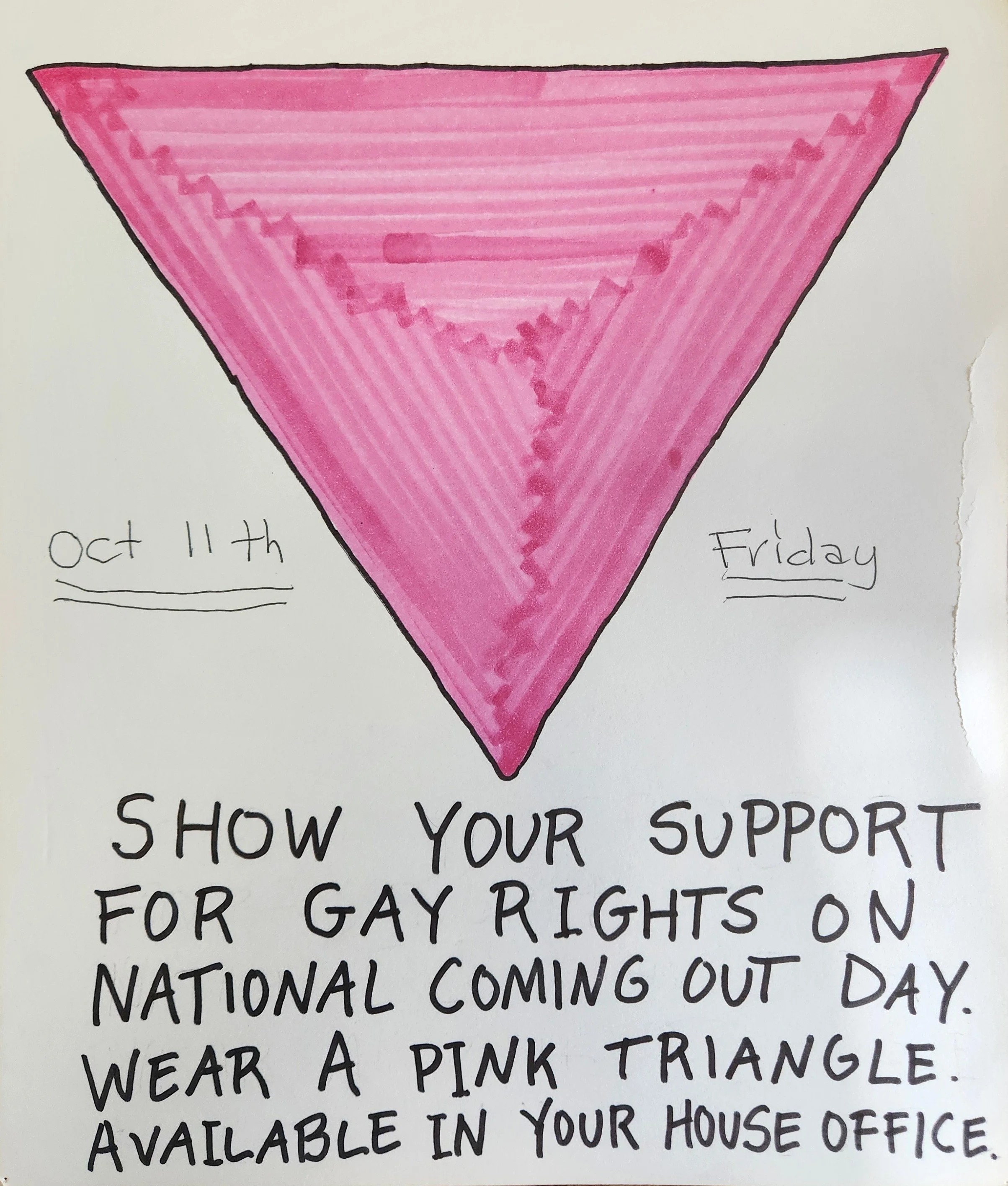 Poster for October 1995 Coming Out Day assembly encouraging students to wear a pink triangle in support of gay rights. The pink triangle is a reclaimed symbol that was once used to label gay men in Nazi concentration camps. Queer History Boston, Coll. 028 - Project 10 East, Folder 54.