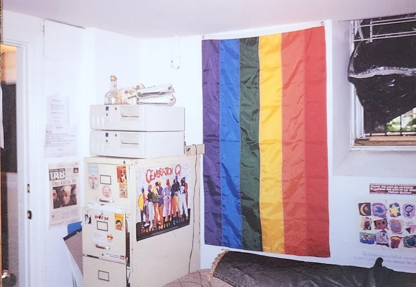 A view inside the Cambridge Rindge and Latin School Gay-Straight Alliance meeting room, not dated (likely c. 1995-1999). Queer History Boston, Coll. 028 - Project 10 East, Photo Album 4.