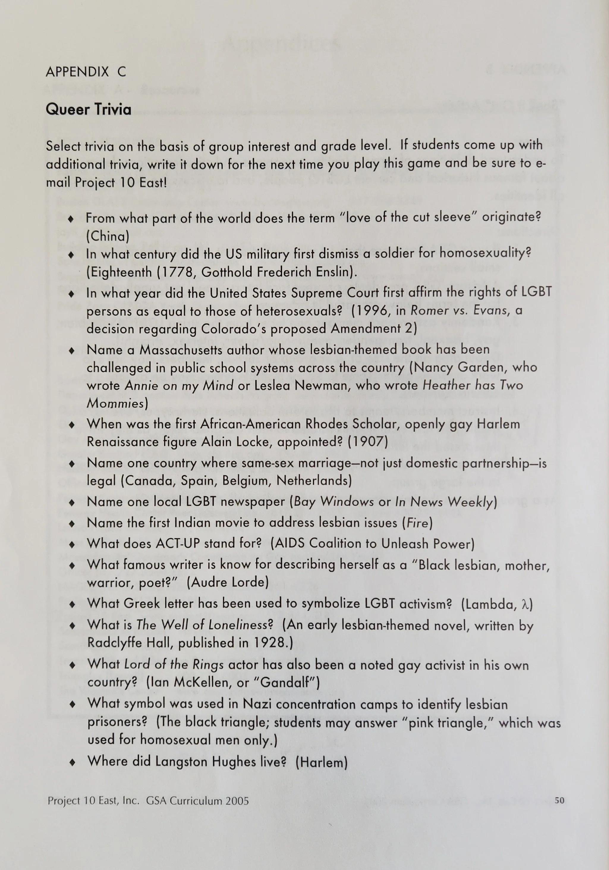 Check out this list of Queer Trivia included in the 2005 curriculum: